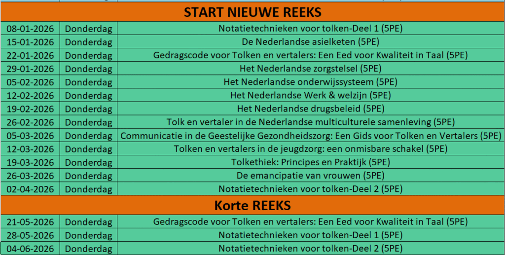 PE-punten – Met uw deelname, leeswerk en kleine vertaal-/vertolkopdracht kunt u per cursus 5 PE-punten verdienen.